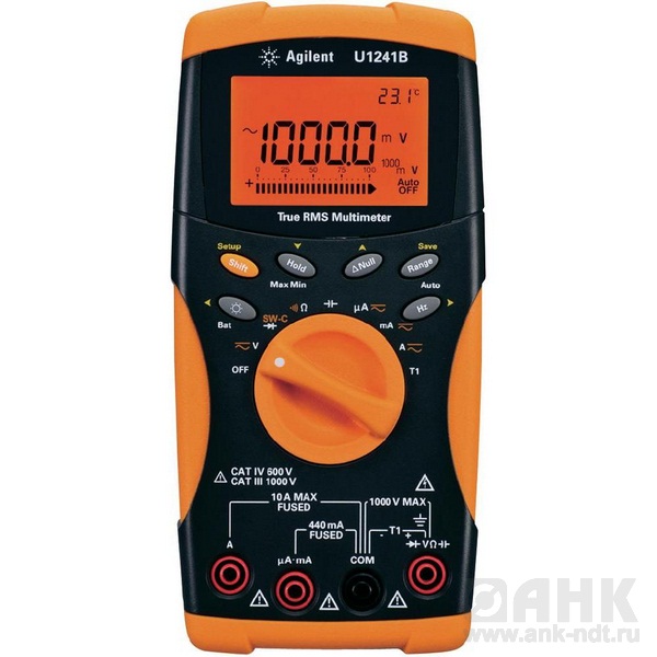 Ручной цифровой мультиметр U1241B. Его особенностью является возможность отображения истинных СКЗ на дисплее с полной шкалой до 10 000 отсчетов. Настраиваемая задняя подсветка позволяет выполнять работу даже при недоста точных условиях освещенности, в то же время увеличивая время действия батареи. Задачи технического обслуживания значительно упрощаются благодаря наличию встроенного счетчика переключений, возможностей измерения температуры по двум каналам и разницы температур, выбираемых простым нажатием клавиши. Мультиметр обладает высокими характеристиками по безопасности, обеспечивая защиту в соответствии с нормами CAT III 1 000 V.
