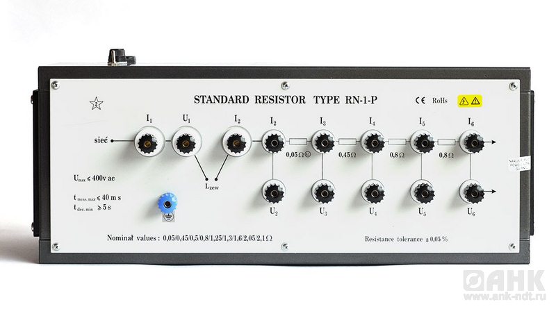 Мера сопротивлений RN-1-P обеспечивает задание активного сопротивления из ряда: 0,05 Ом; 0,45 Ом; 0,5 Ом; 0,8 Ом; 1,25 Ом; 1,3 Ом; 1,6 Ом; 2,05 Ом; 2,1 Ом. Предел допускаемой основной погрешности - ± 0,05% (± 0,1%).