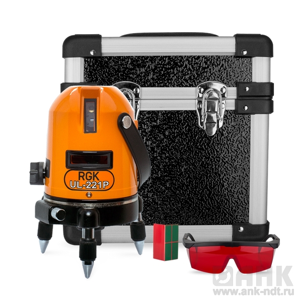 Стандартная комплектация: лазерный нивелир UL-221P, ударопрочный футляр - кейс, очки для работы с лазерными приборами, элементы питания, инструкция на русском языке.