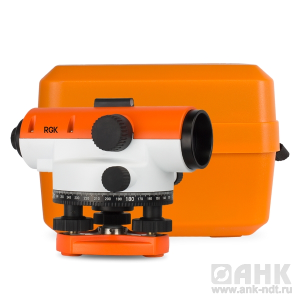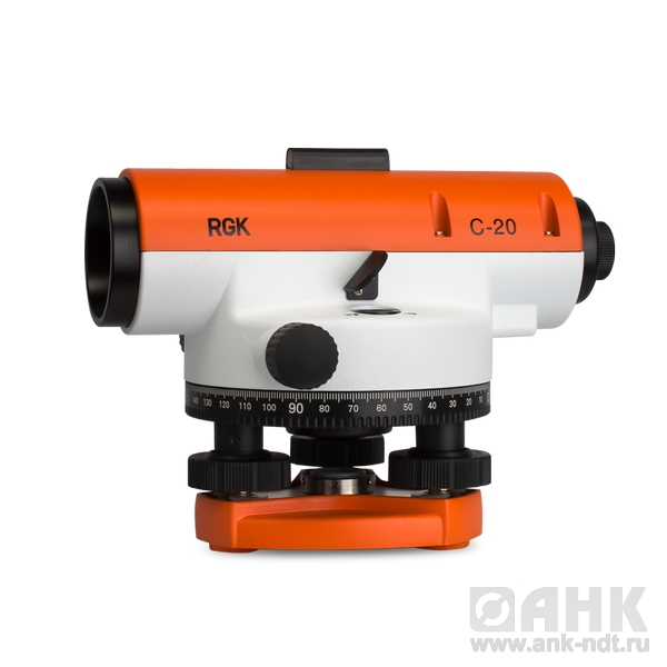 Стандартная комплектация: оптический нивелир RGK C-20, нитяной отвес, юстировочный набор, руководство по эксплуатации, транспортировочный кейс.