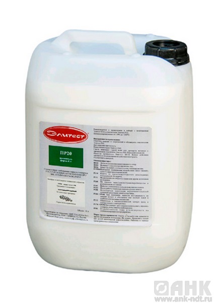 Проявитель белого цвета Элитест ПР20 (быстросохнущий) изготовлен на основе ацетона и предназначен для выявления индикаторных рисунков. Равномерно покрывает поверхность тонким слоем. Быстро высыхает, вытягивая пенетрант из полостей капилляров, образуя чёткое изображение дефектограммы на поверхности, что позволяет уверенно выявлять окрашенные индикаторные следы несплошностей. Обеспечивает высокую чувствительность контроля за счёт растворяющего воздействия на пенетрант в местах расположения дефектов.