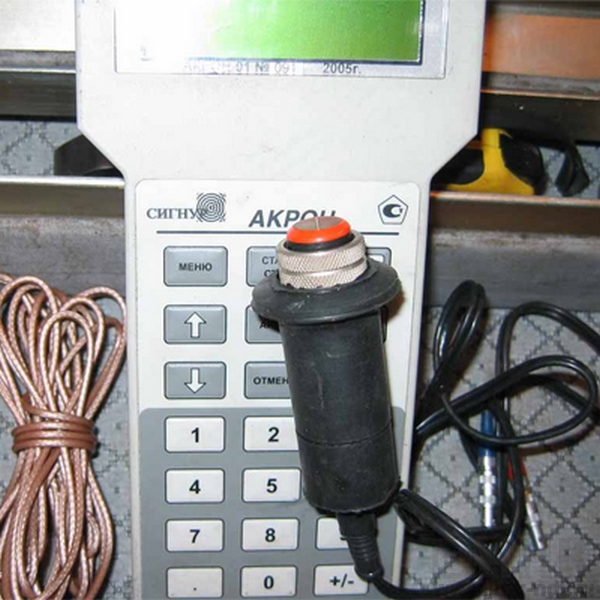 Ультразвуковой расходомер АКРОН-01 включает в себя первичный преобразователь ПП-1 и электронный блок БЭ-2, соединенные радиочастотным кабелем. ПП-1 состоит из двух ультразвуковых излучателей и магнитного устройства для их крепления на трубе. ПП-1 устанавливается на прямолинейном участке трубопровода на очищенной наружной поверхности.