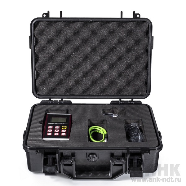 электронный блок, 1 датчик (Fe или NFe), 1 подложка (Fe или NFe), программное обеспечение и USB кабель, 5 настроечных образцов, инструкция по эксплуатации, Сертификат качества, 2 батарейки AA, упаковочный лист, гарантийный талон
