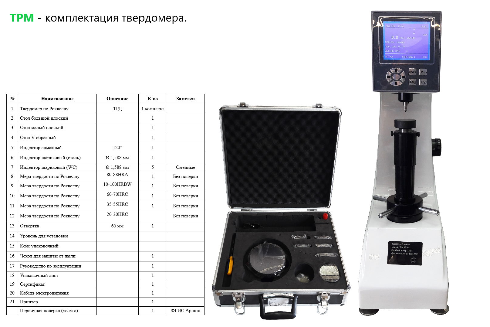 • "Прямое" измерение по 6 шкалам Роквелла: HRA, HRB, HRC, HRD, HRF и HRG и  2 шкалам Супер-Роквелла: HRN и HRT, которые стандартизированы в РФ и на них оформляется свидетельство о поверке твердомера.  Однако прибор осуществляет измерение твёрдости по всем международным шкалам Роквелла и Супер-Роквелла, в совокупности всего 30 шкал: HRA, HRB, HRC, HRD, HRE, HRF, HRG, HRH, HRK, HRL, HRM, HRP, HRR, HRS, HRV, HR15N, HR30N, HR45N, HR15T, HR30T, HR45T, HR15W, HR30W, HR45W, HR15X, HR30X, HR45X, HR15Y, HR30Y, HR45Y.