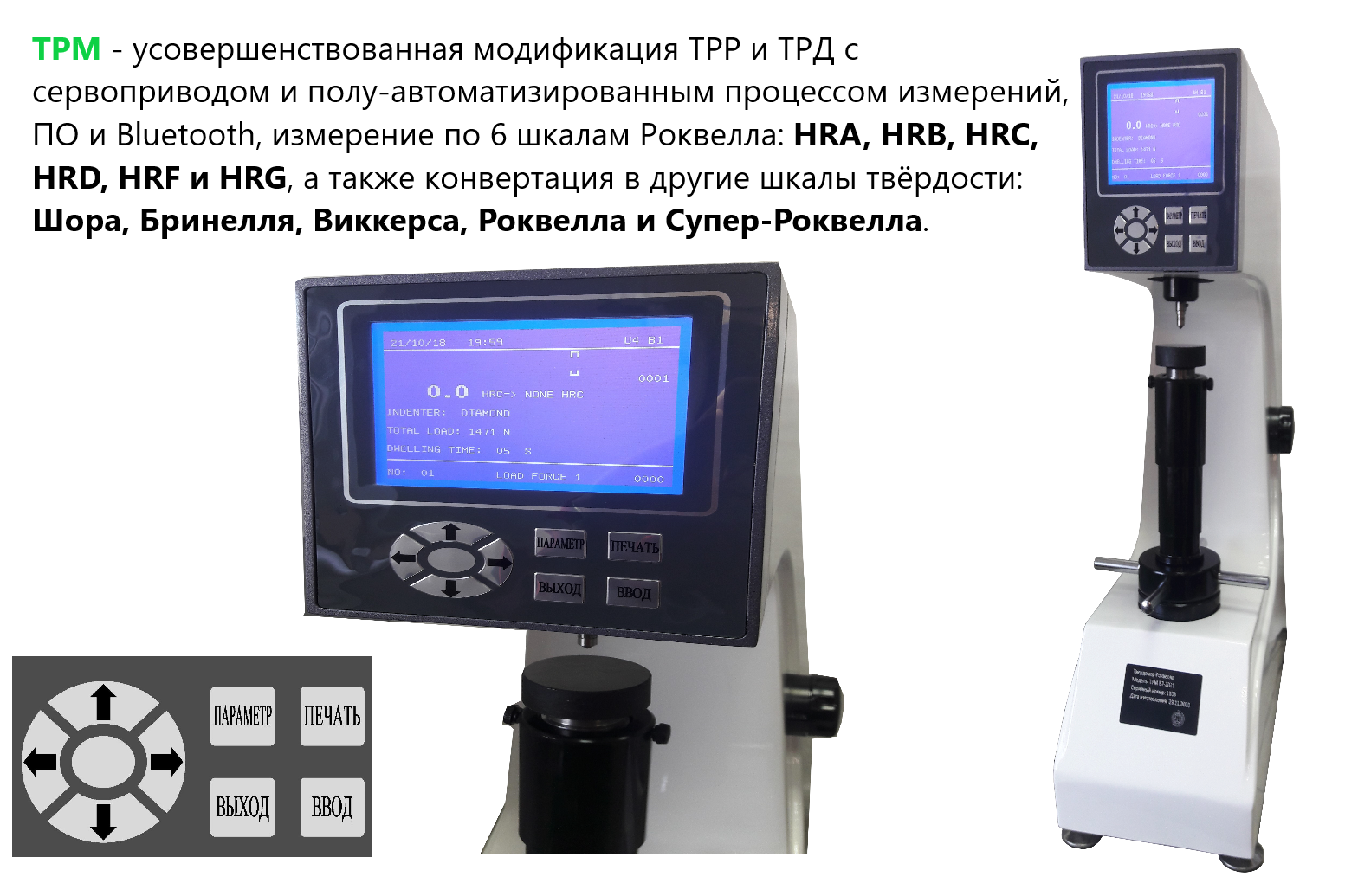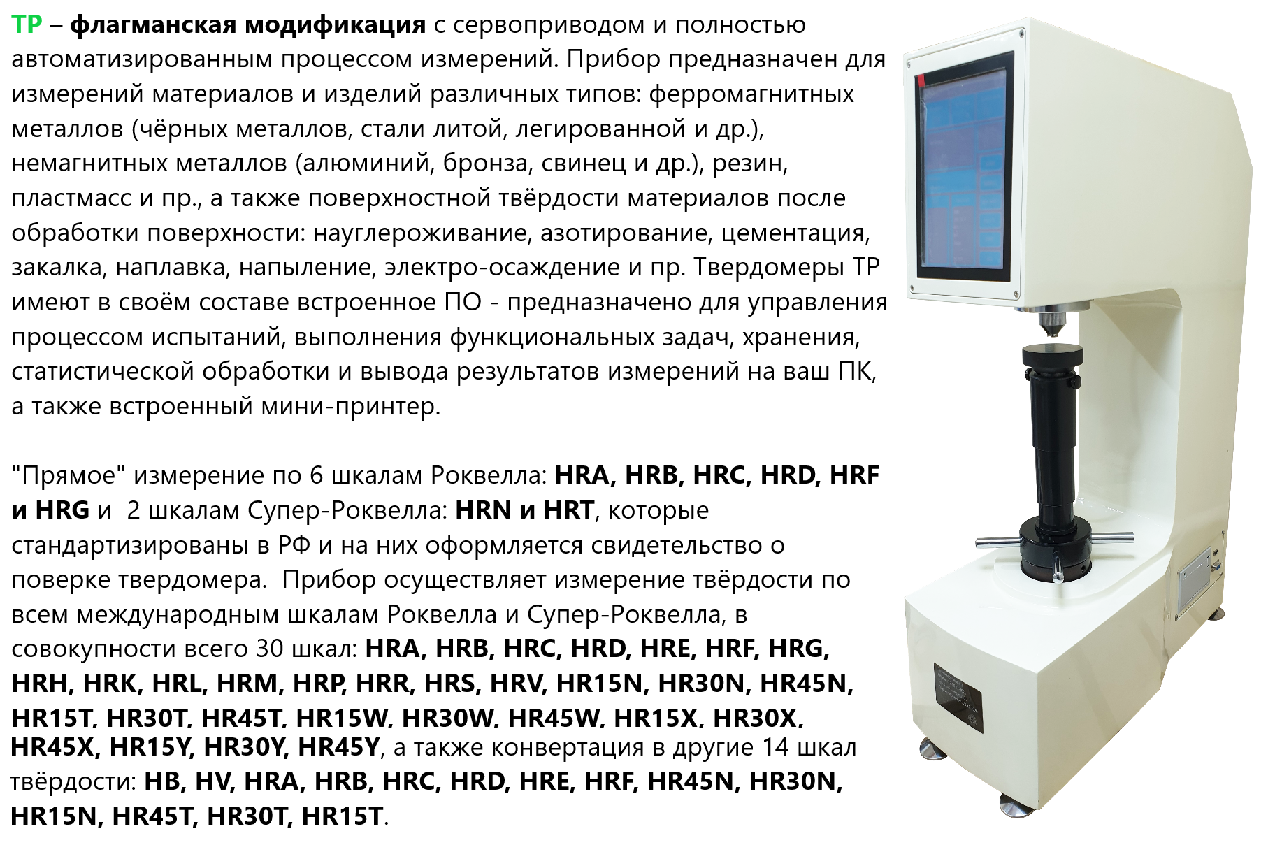 ТР – цифровой стационарный твердомер по методу Роквелла (шкалы HRA, HRB, HRC, HRD, HRF, HRG, HRL, HRM и HRR) и Супер-Роквелла (шкалы HRN и HRT): флагманская модификация по всем стандартизированным в РФ шкалам Роквелла и Супер-Роквелла - моторизированная модель с сервоприводом и полностью автоматизированным процессом измерений (условная расшифровка Твердомер Роквелла). Прибор предназначен для измерений материалов и изделий различных типов: ферромагнитных металлов (чёрных металлов, стали литой, легированной и др.), немагнитных металлов (алюминий, бронза, свинец и др.), резин, пластмасс и пр., а также поверхностной твёрдости материалов после обработки поверхности: науглероживание, азотирование, цементация, закалка, наплавка, напыление, электро-осаждение и пр. Помимо т. н. "прямого" измерения твёрдости по методу Роквелла путём непосредственного нагружения (терминология по ГОСТ 23677-79), прибор также позволяет измеренные результаты по шкалам Роквелла и Супер-Роквелла "переводить/конвертировать/пересчитывать" в шкалы Бринелля и Виккерса  - т. н. "косвенное" определение твёрдости, корреляция по стандарту ASTM E-140. Твердомеры ТР имеют в своём составе встроенное программное обеспечение - предназначено для управления процессом испытаний, выполнения функциональных задач, хранения, статистической обработки и вывода результатов измерений на ваш ПК, а также встроенный мини-принтер.
