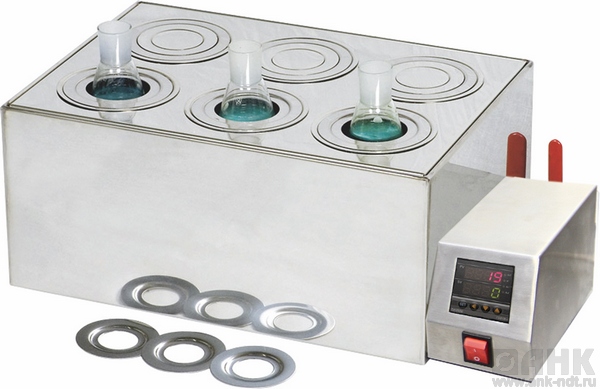 • Система из 4-х концентрических колец позволяет размещать в ванне различные колбы объемом до 1 л, стаканы, чашки для выпаривания и т.д.;