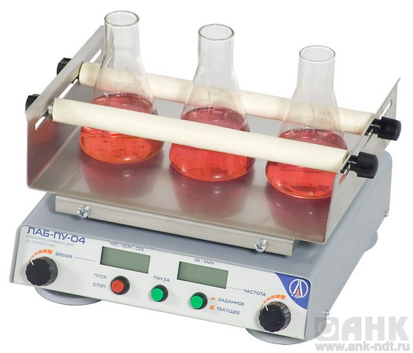 Микропроцессорный контроллер, снабженный таймером, позволяет задавать необходимые условия перемешивания любых жидких компонентов в колбах, делительных воронках, пробирках и другой лабораторной посуде.