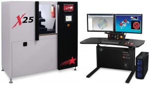 X25 - компактная система, которая предлагает все те же возможности, что и более крупные, при этом сохраняя способность соответствовать по толщине размеру стандартной внутренней двери помещения. Система оснащается на выбор либо микрофокусной рентгеновской трубкой закрытого типа, не требующей дополнительного обслуживания в процессе эксплуатации, с максимальным ускоряющим напряжением 150 кВ, максимальной мощностью 75 Вт и фокальным пятном <5 мкм (8 Вт), либо нанофокусной рентгеновской трубкой открытого типа с ускоряющим напряжением 160 кВ, максимальной мощностью 20 Вт и фокальным пятном <0,5 мкм (10 Вт). В качестве детектора рентгеновского излучения используется Varex 2520DX, позволяющий получить максимальное разрешение и высокий контраст отдельных деталей изображения, а дополнительная вольфрамовая защита электроники увеличивает срок его эксплуатации. Томограф имеет пятиосевое позиционирование всей системы (вращение, перемещение образца в плоскости держателя и перемещение детектора вдоль оптической оси) с режимом микропозиционирования в горизонтальном и вертикальном направлениях - для точного выбора интересующей области сканирования и общего сокращения времени съемки. Система поставляется с собственным программным обеспечением для режимов сканирования: цифровая двухмерная рентгенография, трехмерная компьютерная томография со сверхбыстрой реконструкцией и четырехмерная томография (возможность дополнительно проводить механические, температурные испытания, включая собственное движение образца во время съемки). Кроме того, имеется возможность проведения координатных измерений и использования интегрированного промышленного робота.