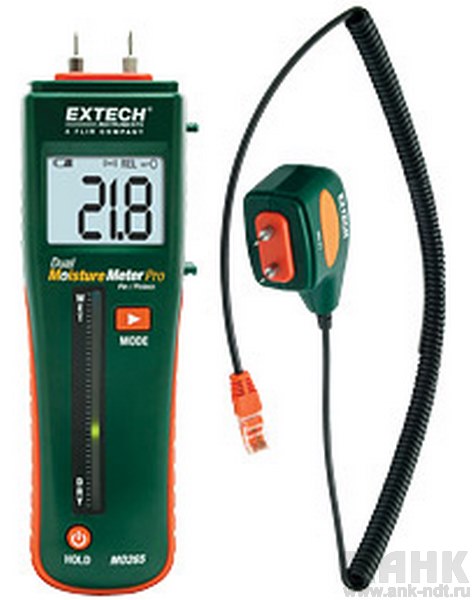 Комбинированный штифтовой/бесконтактный измеритель влажности Extech MO265 c дистанционным зондом позволяет проводить измерения влажности древесины и других строительных материалов без нарушения поверхности объекта.