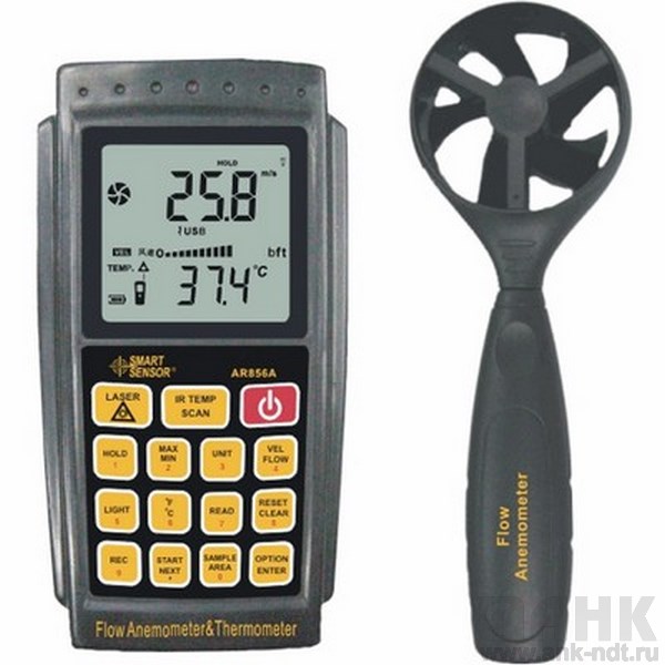 Цифровой анемометр AR856A помимо измерения скорости ветра имеет множество других функций. Прибор позволяет производить вычисления с полученными данными, измерять температуру и относительную воздушную температуру. Для целей измерения температуры прибор имеет встроенный инфракрасный термометр. Кроме всего прочего, данная модель позволяет измерять объем потока воздуха. Электронный анемометр - это своего рода портативный компьютер, позволяющий производить  многофункциональные интеллектуализированные измерения. Анемометр AR856A может использоваться во многих сферах деятельность, связанных с прохождением потока воздуха, таких как сфера отопления, вентиляция, кондиционирование воздуха. Обширное применение устройстваимеет место в защите окружающей среды, контроле энергосбережения, метеорологии, сельском хозяйстве, охране труда, химическом и тканном производстве, лабораториях. Прибор оснащен USB интерфейсом для взаимодействия с компьютером.