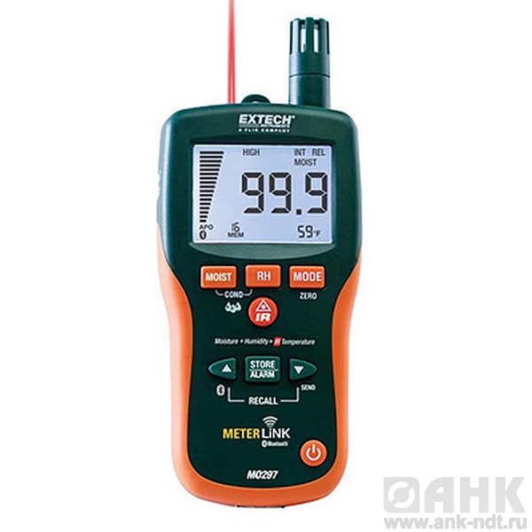 Бесштифтовой психрометр/ измеритель влагосодержания с инфракрасным термометром Extech MO297 прибор с передатчиком Bluetooth и MeterLink. С Функцией беспроводной передачи данных о влажности на инфракрасную камеру FLIR с высокой степенью разрешения для объединения показаний прибора и теплового изображения. Функция одновременного отображения содержания влаги в исследуемых материалах, температуры воздуха, ИК температуры или влажности воздуха. Встроенный зонд.