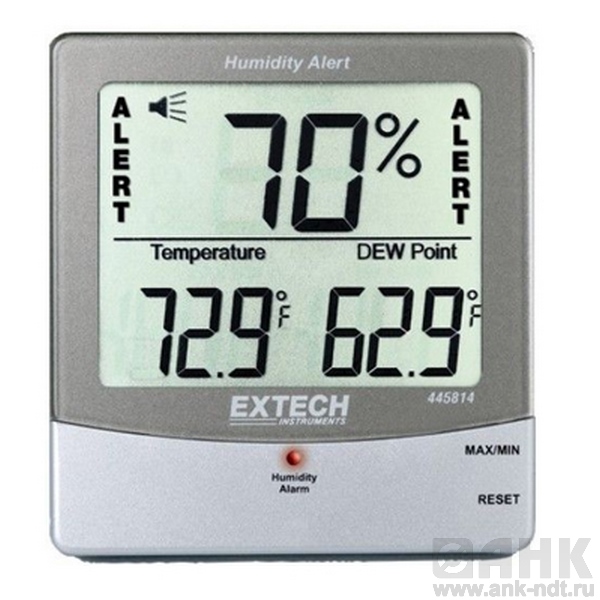 Гигротермометр Extech 445814 для измерения влажности, температуры и точки росы с большим легко читаемым тройным ЖК-дисплеем, отображающим влажность, температуру и точку росы. Имеются звуковые и визуальные сигналы при превышении установленных пределов влажности. Отображает температуру точки росы.