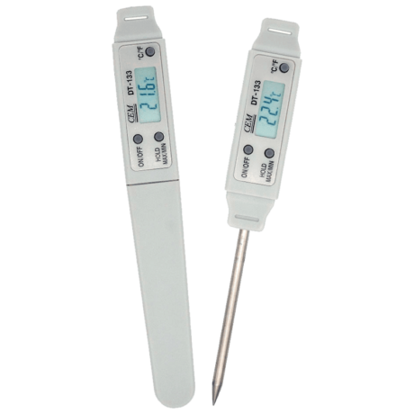 • Порядок работы. Для работы с термометром необходимо снять защитный чехол, нажать кнопку «ON/OFF» (Вкл. /Выкл.) и поместить щуп (не менее, чем наполовину своей длины) в измеряемую среду. На экране отображается текущее значение температуры среды измерения. Для увеличения реального срока службы батареи термометр автоматически выключается примерно через 45 минут.  Поверка термометра электронного DT-133 осуществляется в аккредитованной лаборатории АНК и занимает от 1 до 5 дней.
