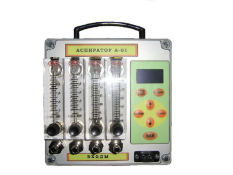 На лицевой панели корпуса аспираторов размещены ротаметры с входными штуцерами каналов и ручками установки (регулировки) расходов, сетевой разъем, дисплей, панель управления с кнопками включения/выключения прибора и насоса, кнопками программирования. Разъем для подключения к сети 12 В расположен на противоположной панели аспиратора.