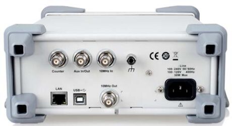 На задней панели генераторов располагаются: разъем для подключения кабеля питания, интерфейсы связи с персональным компьютером, входной разъем встроенного частотомера для контроля частоты сигнала, входной/выходной разъем опорной частоты 10 МГц, универсальный разъем (вход сигнала внешней модуляции и сигнала запуска, выход сигнала запуска и сигнала синхронизации).
